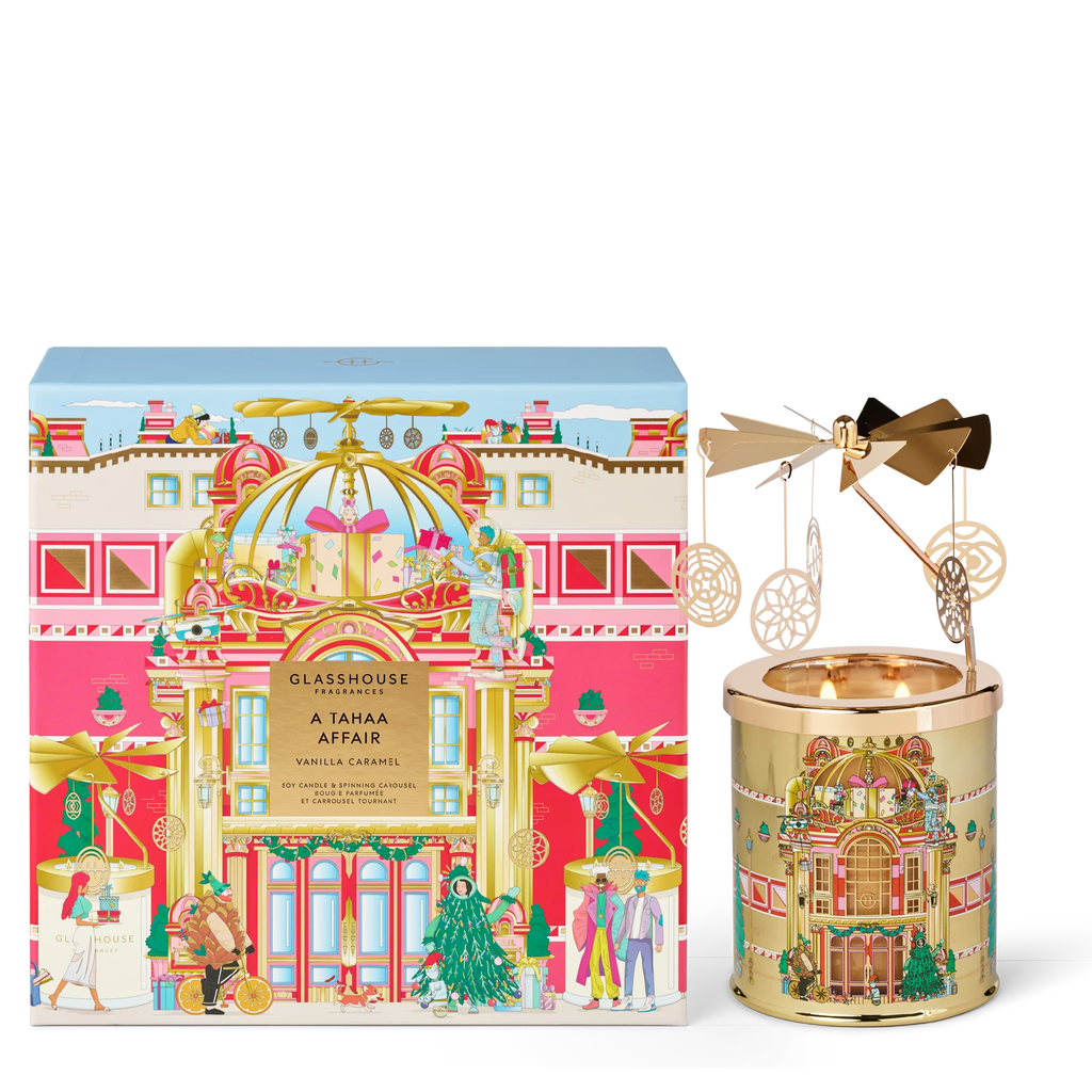 Contains 1 x 380g A Tahaa Affair candle and 1 x spinning carousel all wrapped in a gorgeous boxed gift set with illustrations by Aeoniumsky.